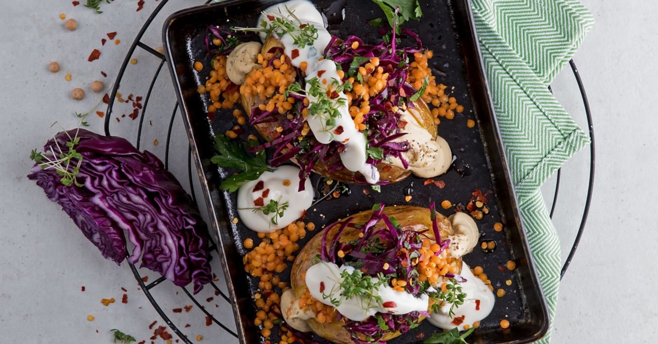 Die gegarten Kartoffeln aus dem Ofen nehmen und die Folie entfernen. Der Länge nach aufschneiden, aber nicht ganz durchschneiden. Die Kartoffelhälften auseinanderziehen und mit einer Gabel das Innere etwas lockern. Übriges Olivenöl über die Kartoffeln träufeln. Hummus in den Kartoffeln verteilen. Den Rotkohl-Petersiliensalat darauf geben und mit den Linsen bestreuen.