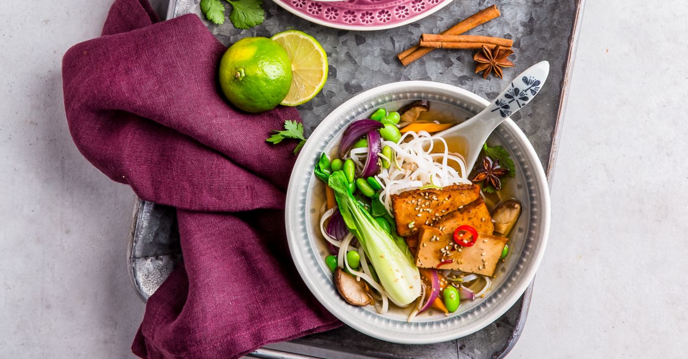 Reisnudeln mit Gemüse auf 2 Schalen verteilen, mit kochend heißem Sud übergießen, mit gebratenem Tofu, Minze und Sesam bestreut genießen.