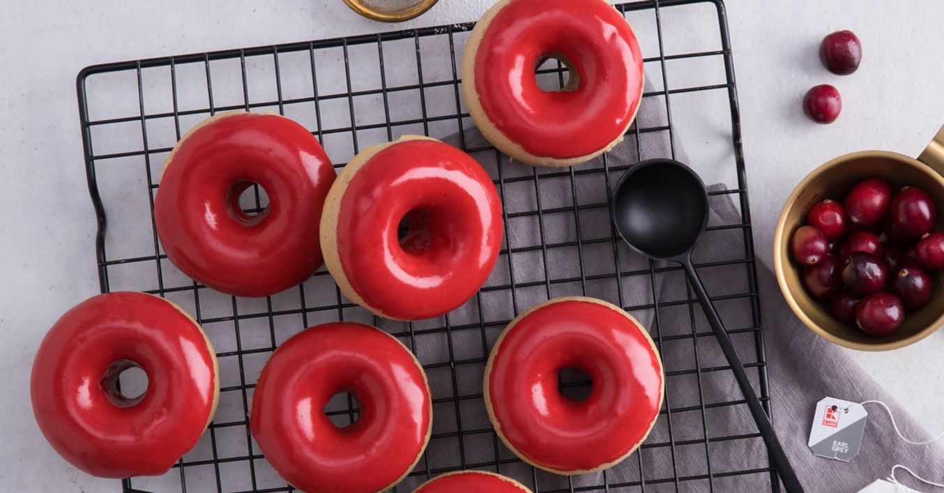 Donuts herausnehmen und circa 30 Minuten auskühlen lassen. Puderzucker mit 1 Esslöffel Wasser und dem Cranberry-Sirup glatt rühren.