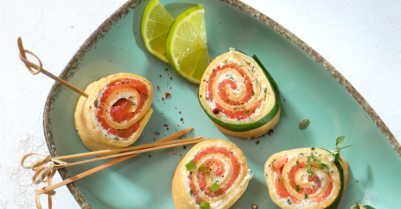 Eine beschichtete Pfanne auf mittlere Hitze aufheizen, leicht mit Rapsöl einfetten, nacheinander 4 Pfannkuchen ausbacken und auskühlen lassen. Pfannkuchen gleichmäßig mit Kräutercreme bestreichen und mit den Lachsscheiben belegen.