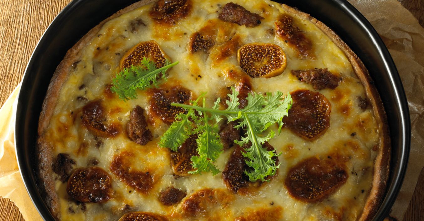 Für den Belag Zwiebeln in Ringe schneiden und Feigen halbieren. Öl in einer hohen Pfanne erhitzen und Zwiebelwürfel darin glasig dünsten. Hackfleisch hinzufügen und mitbraten. Feigenhälften untermischen und mit Rotweinessig ablöschen. Mit Salz, Pfeffer und Koriander abschmecken.