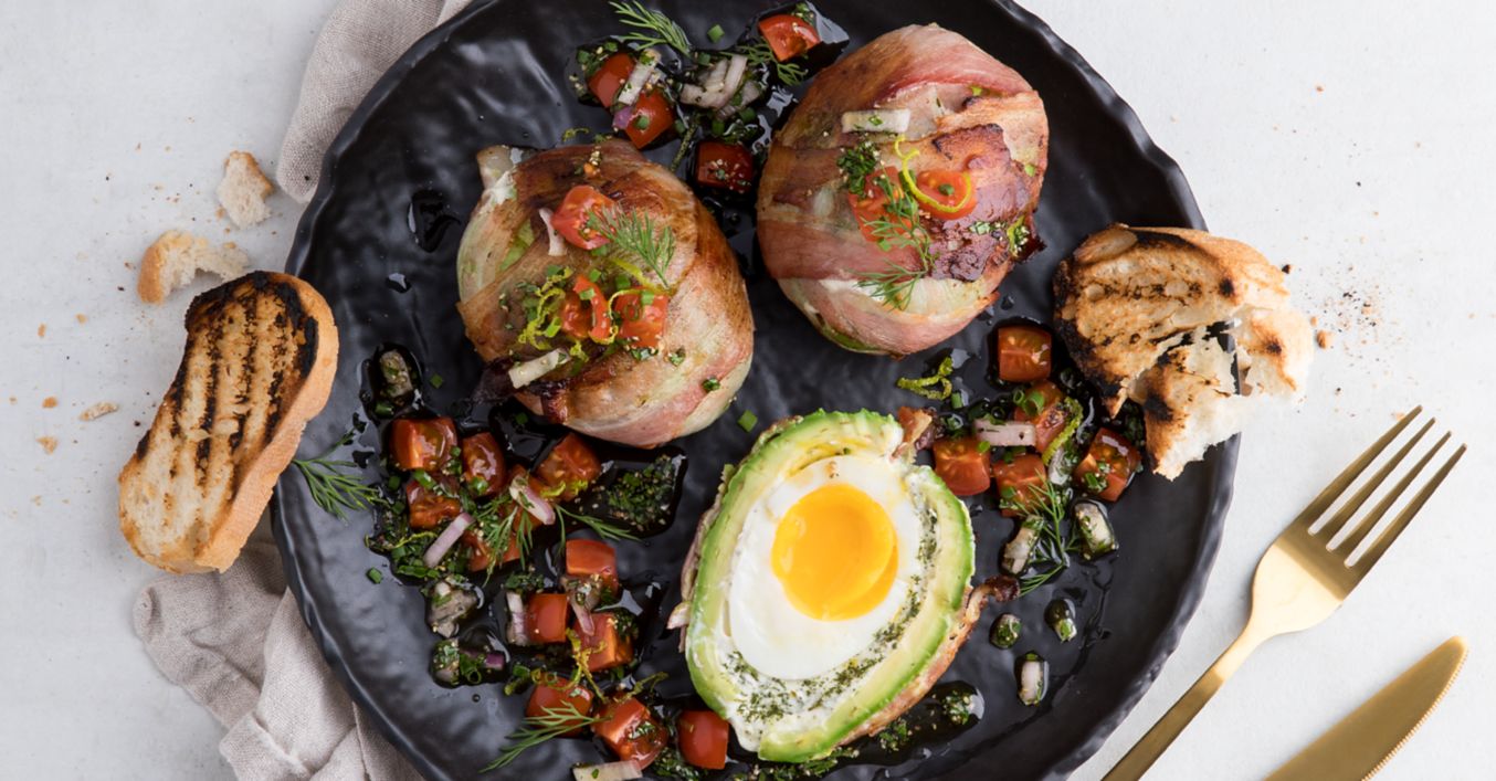 Avocados halbieren, entkernen und in die Kuhle etwas Kräuterfrischkäse geben. Eier jeweils vorsichtig hineinsetzen und die zweite Hälfte wieder aufsetzen. Die gefüllten Avocados jeweils mit drei Scheiben Bacon umwickeln. Rapsöl in einer Pfanne erhitzen und Avocados rundherum anbraten.