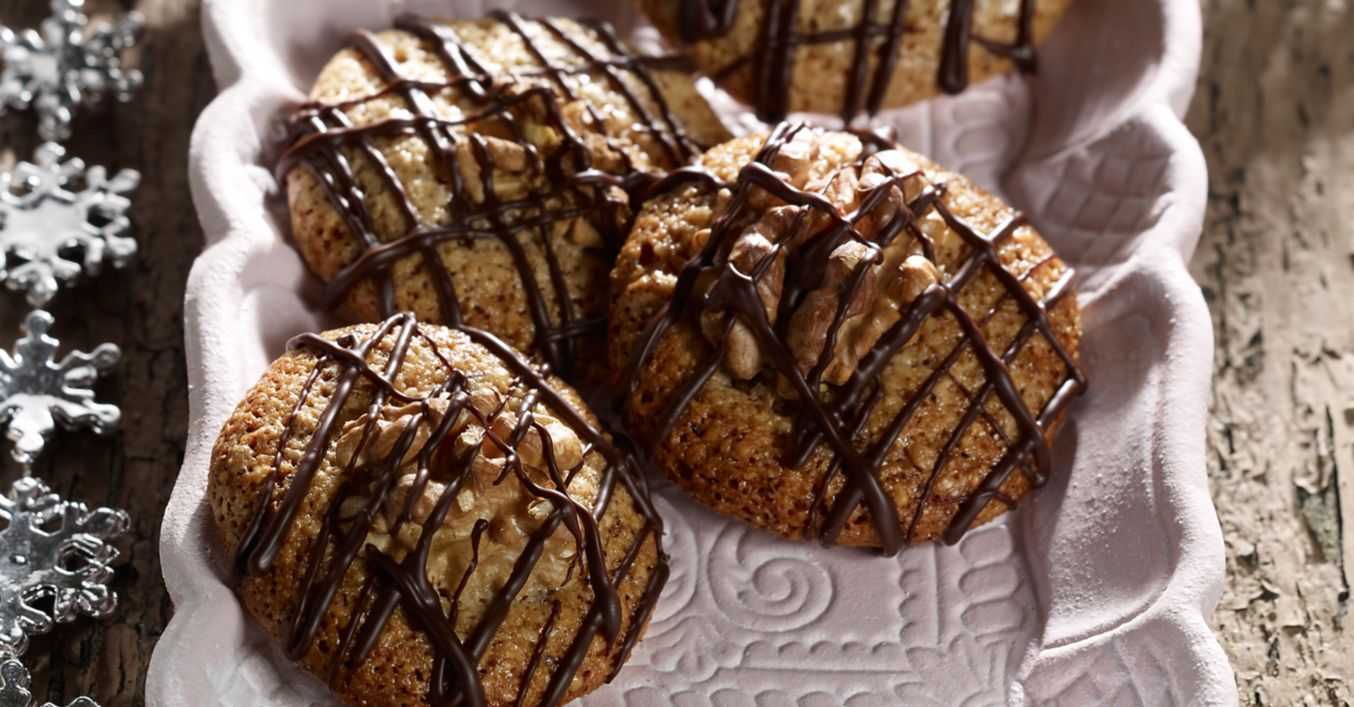 Plätzchen auf ein mit Backpapier ausgelegtes Backblech setzen, mit je 1 Walnusshälfte belegen und im vorgeheizten Backofen bei 180 Grad Celsius (Gas: Stufe 3, Umluft 160 Grad Celsius) ca. 12 bis 15 Minuten goldbraun backen.