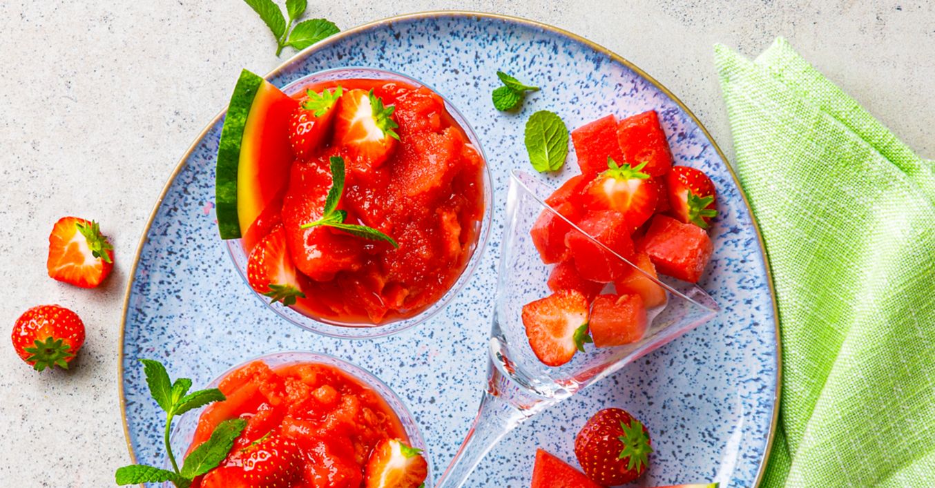 Wassermelone schälen, in circa 3 ZEntimeter große Würfel schneiden und in einer flachen Form ungefähr 6 Stunden einfrieren.