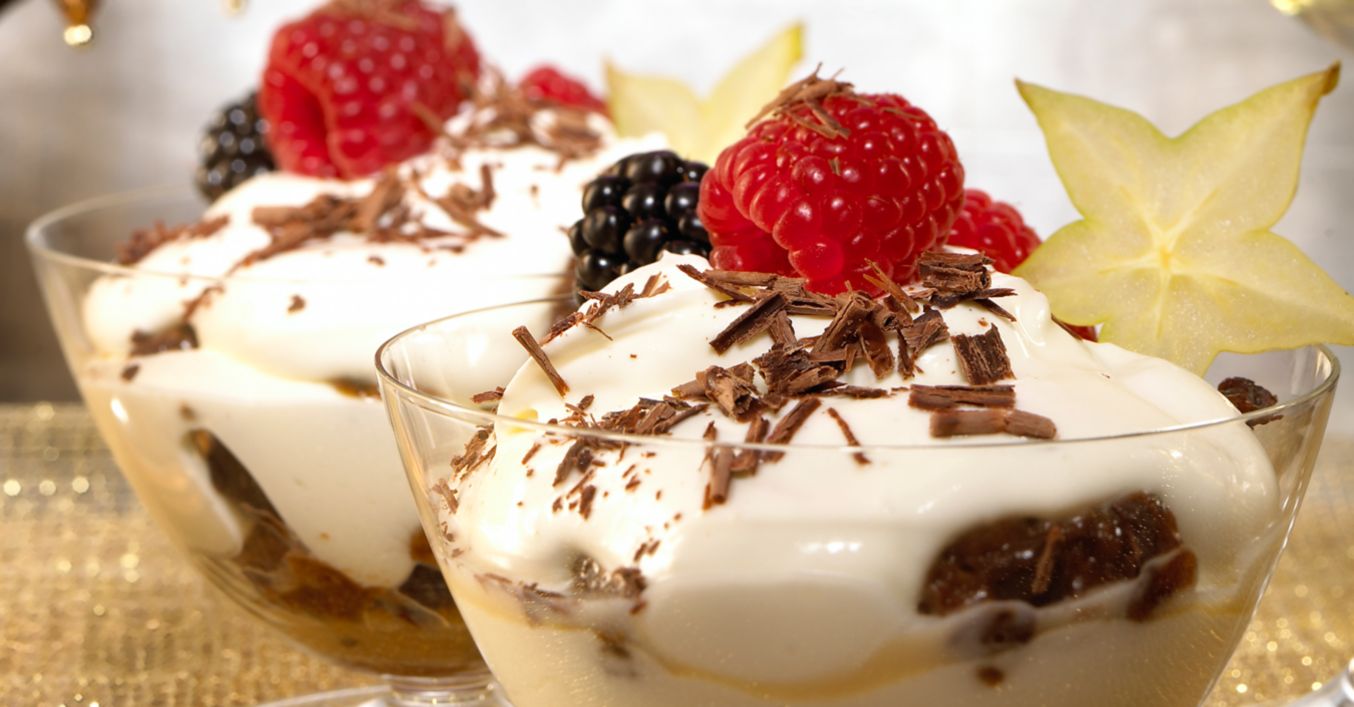 Vor dem Servieren mit frischen Beeren, Karambole und Schokoladenraspeln garnieren.