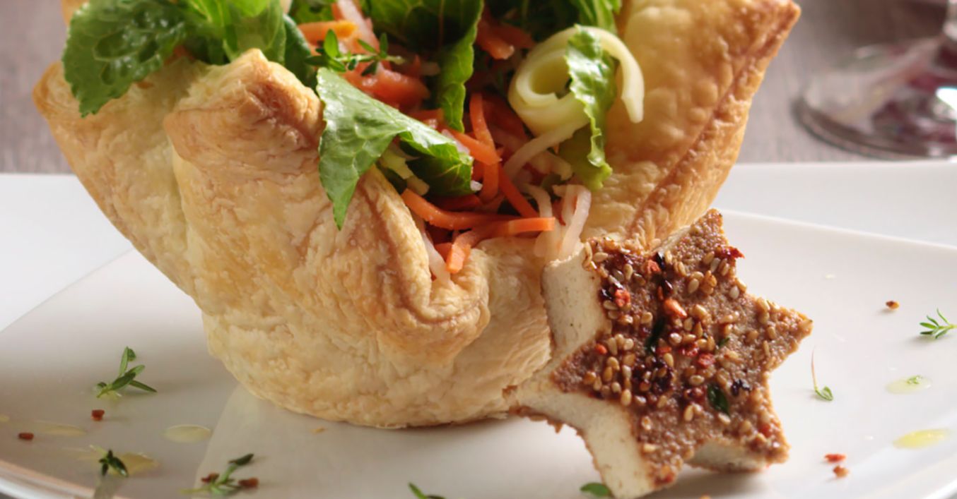 Dressing mit Sellerie- und Karottensalat, Salatherzen und Käseröllchen vermischen und in die Blätterteigschalen füllen. Mit Tofusternen garnieren und servieren.