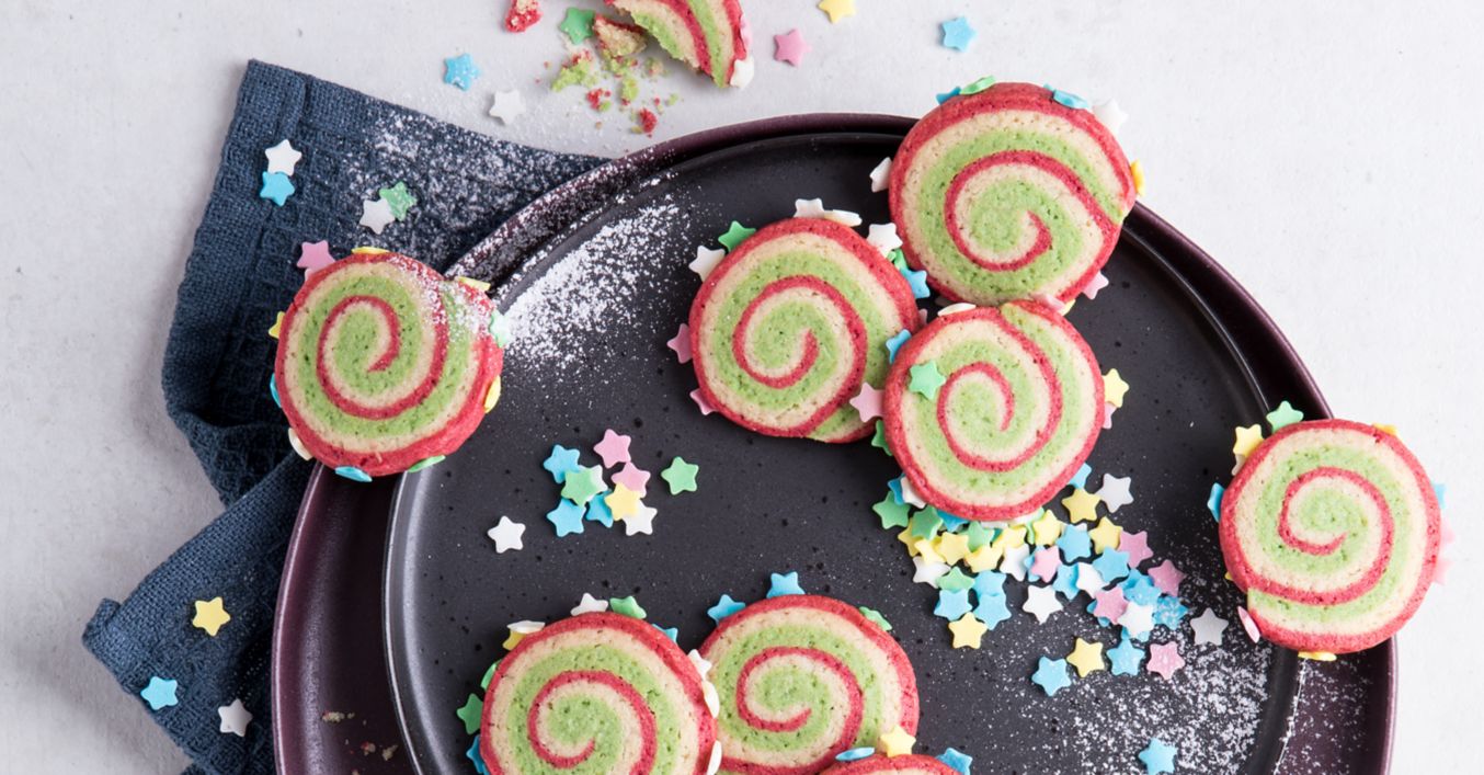 Teige circa 3 Millimeter dick zu Rechtecken ausrollen und aufeinanderlegen. Teigstapel aufrollen und in Zuckersternen oder -streuseln wälzen. Teigrolle in circa 1,5 Zentimeter dicke Scheiben schneiden, auf mit Backpapier ausgelegte Backbleche legen und im vorgeheizten Backofen bei 160 °C Umluft 12 bis 18 Minuten backen.