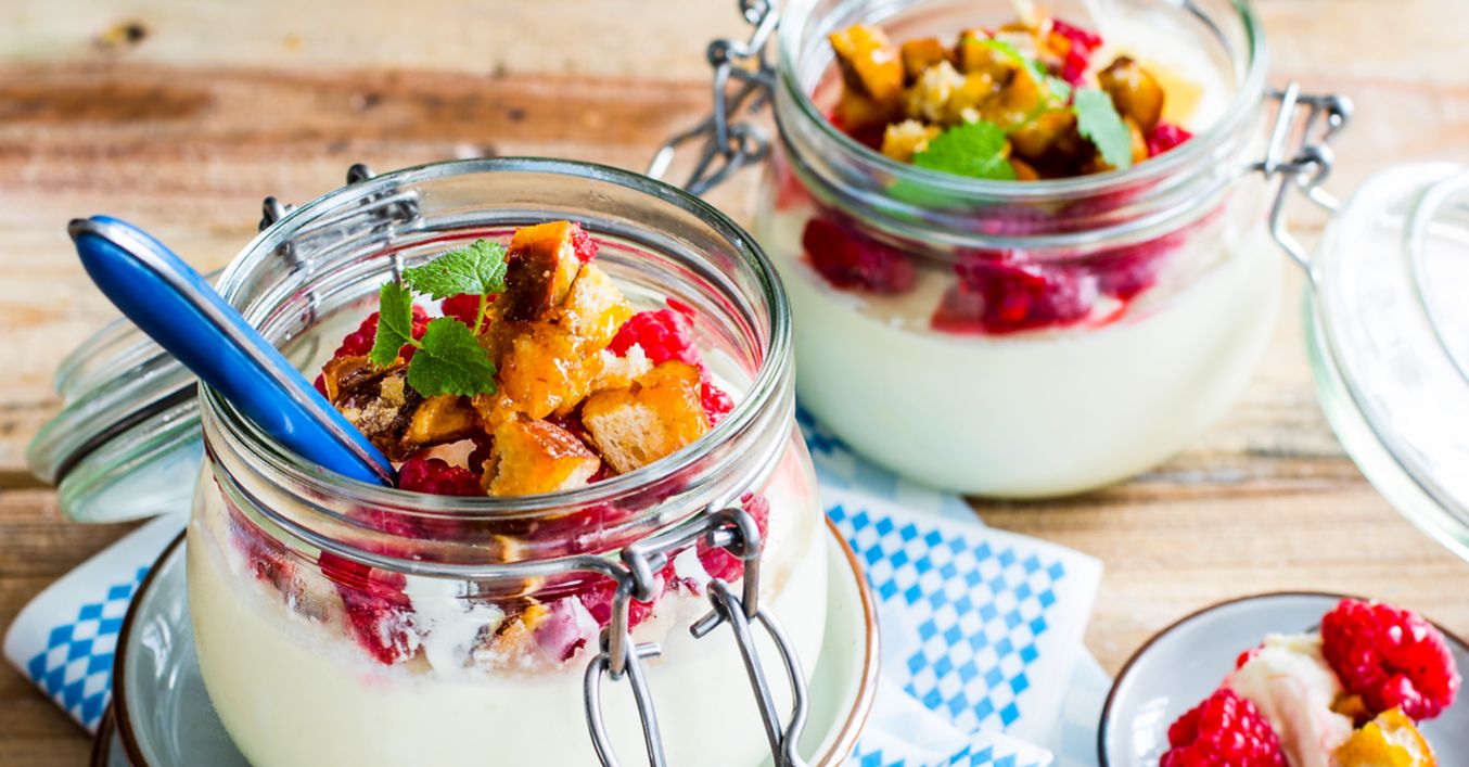 In der Zwischenzeit restlichen Zucker in einer Pfanne erhitzen und karamellisieren lassen. Brötchen klein würfeln. Brotwürfel im Karamell schwenken und anschließend auf Backpapier auskühlen lassen. Himbeeren und Minze waschen, trockenschütteln und die Blätter abzupfen. Creme aus dem Kühlschrank nehmen und mit Crumble, Himbeeren und Minze garnieren.