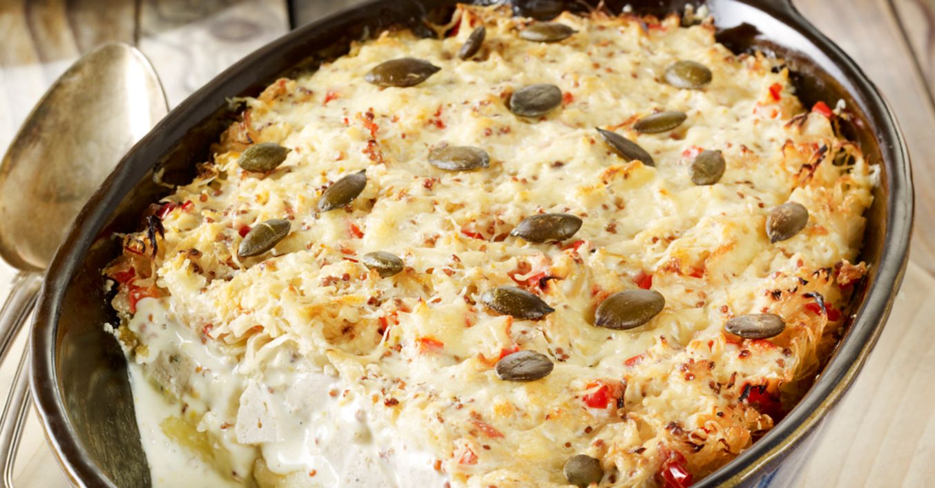 Kürbiskerne in einer beschichteten Pfanne rösten, über den Auflauf streuen und servieren.