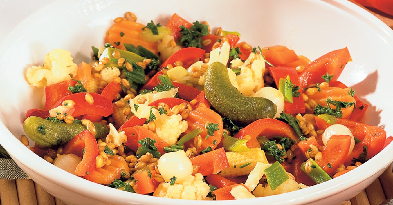 Paprika in Streifen und Frühlingszwiebeln in Ringe schneiden. Paprikastreifen und Frühlingszwiebelringe zum Weizen geben und weitere circa 5 Minuten garen. Mixed Pickles abtropfen lassen, hinzugeben und mit Zitronensaft, Cayennepfeffer und Salz pikant abschmecken. Petersilie untermischen und servieren.