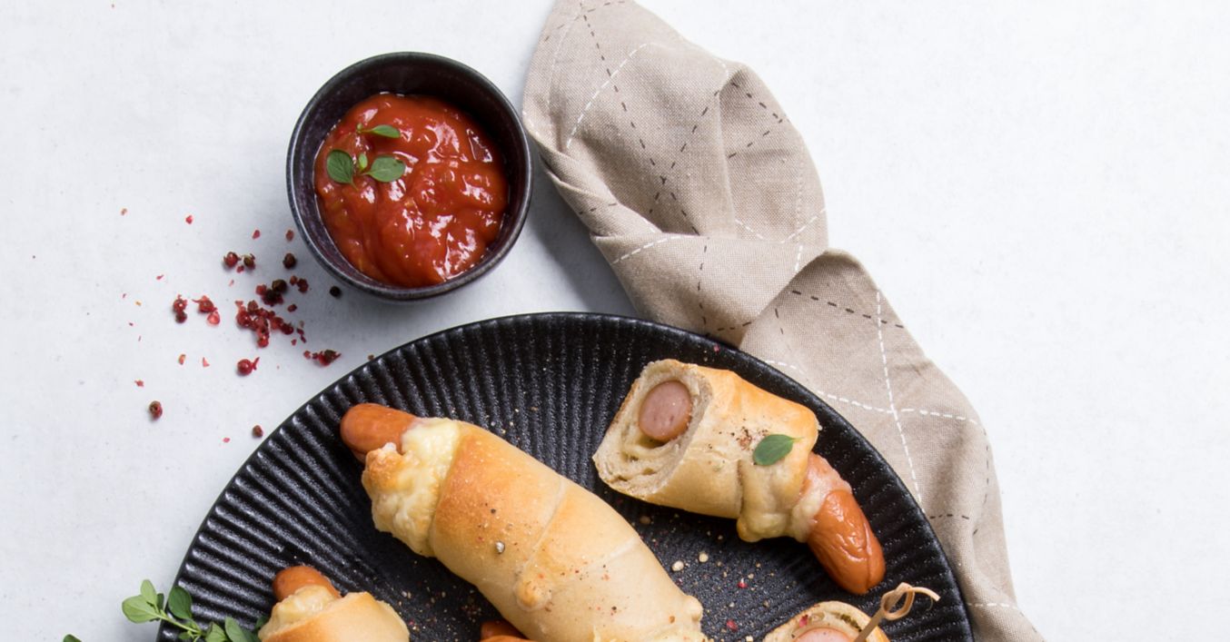 Brötchenteig etwas ausrollen, erst mit Käse und dann mit den Würstchen belegen und eng aufrollen.
