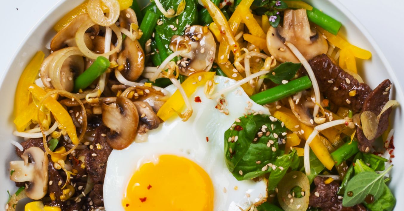 Die Reisbowls mit Fleisch, Champignons, Bohnen, Paprika, Spinat, Mungobohnensprossen, Mais und Petersilie belegen und mit einem Topping aus Sesam und Soja-Marinade servieren.