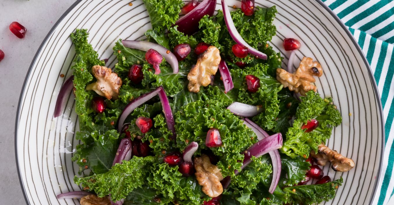 Grünkohlsalat auf Tellern anrichten und mit Granatapfelkernen und den angerösteten Walnüssen bestreut servieren.