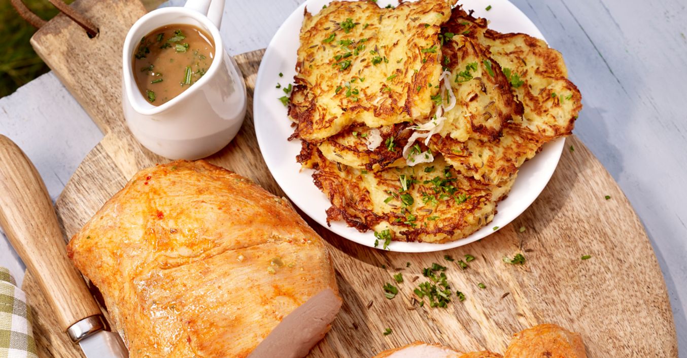 Würzbraten mit Kartoffel-Sauerkraut-Rösti und Kräutersoße