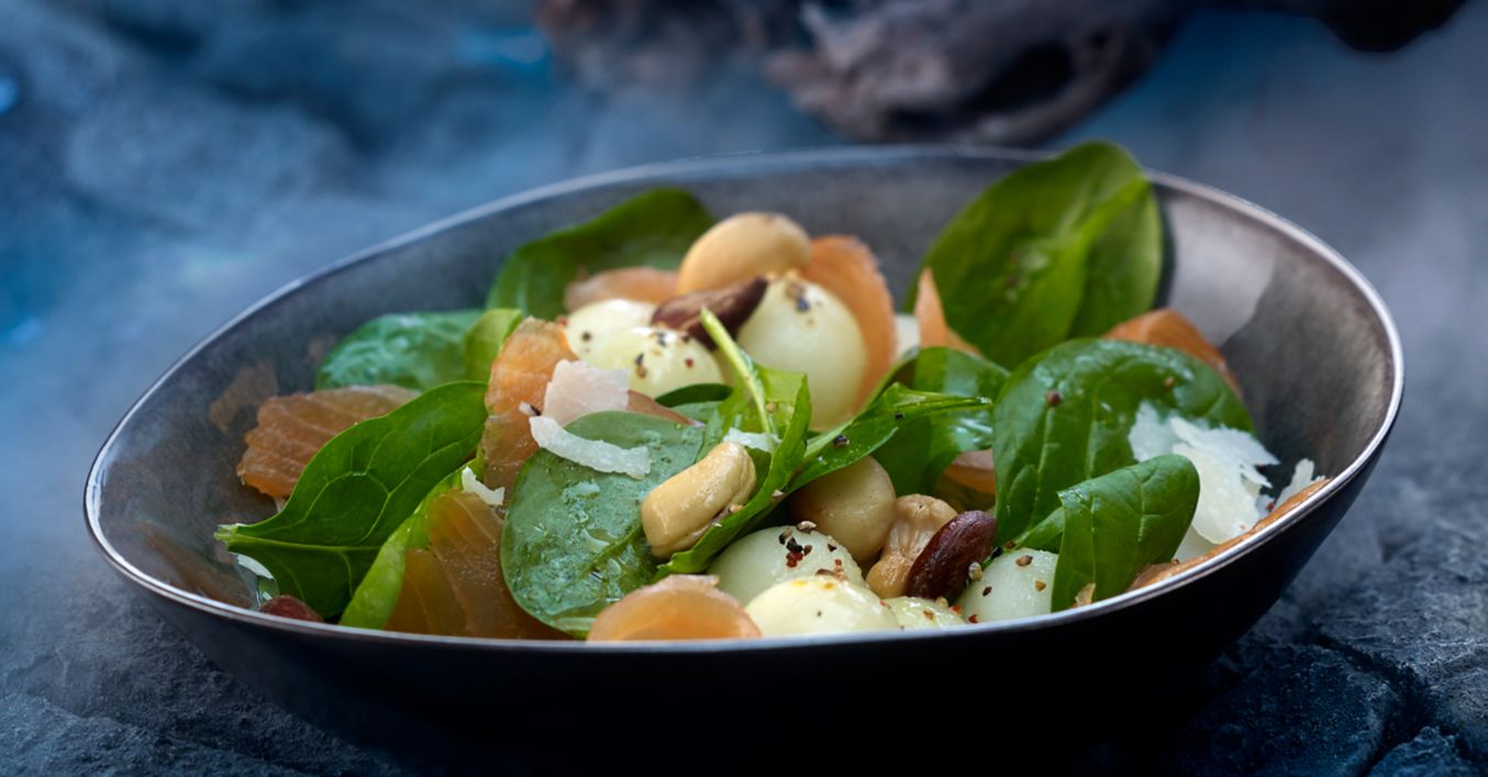 Nun auf einem Teller die Blätter des Spinates und die Melonenwürfel anrichten. Die Lachsscheiben auf dem Salat verteilen sowie die Nüsse darüber streuen. Das Dressing über dem Salat verteilen. Falls gewünscht, Parmesan über den Salat streuen.