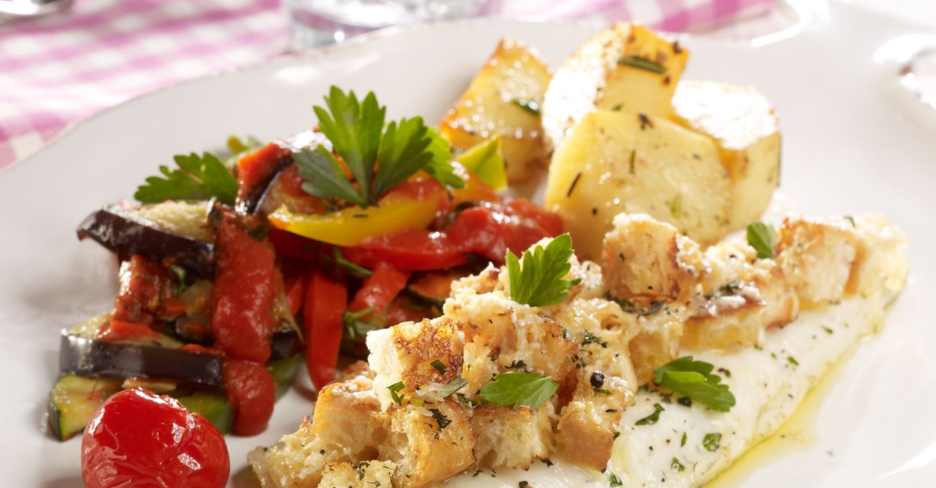 Parmesan, Butter und Croûtons vermischen. Fischfilet mit der Haut nach unten in eine Auflaufform geben, mit der Parmesanmischung belegen und im vorgeheizten Backofen bei 180 Grad (Gas: Stufe 3, Umluft: 160 Grad) circa 15 bis 20 Minuten garen.