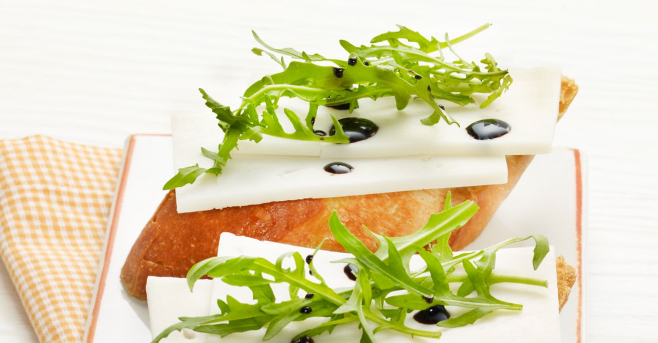 Ziegenkäsescheiben halbieren und auf den Baguettescheiben verteilen. Rucola waschen, putzen, in mundgerechte Stücke zupfen und auf den Ziegenkäse legen.