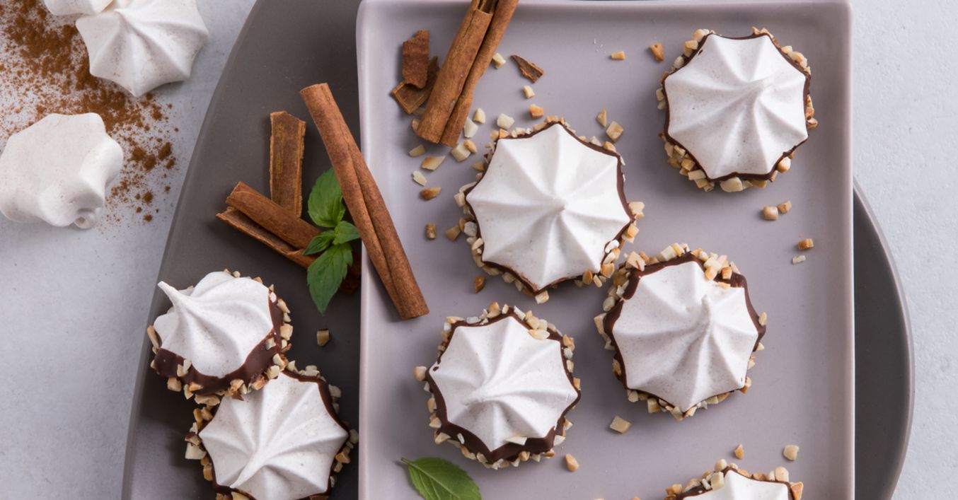 Zimtpulver vorsichtig unter den Eischnee heben, Baisermasse in einen Spritzbeutel mit Sterntülle füllen und im Abstand von 1 bis 2 Zentimetern circa 4 Zentimeter große Häubchen auf ein mit Backpapier ausgelegtes Backblech spritzen.