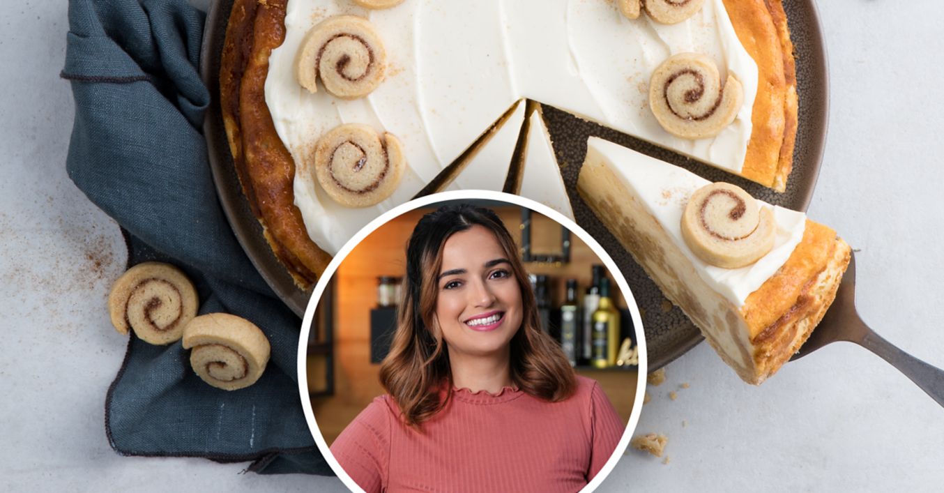 Cheesecake-Oberfläche mit dem Frosting einstreichen und die Zimtschnecken als Dekoration verteilen.