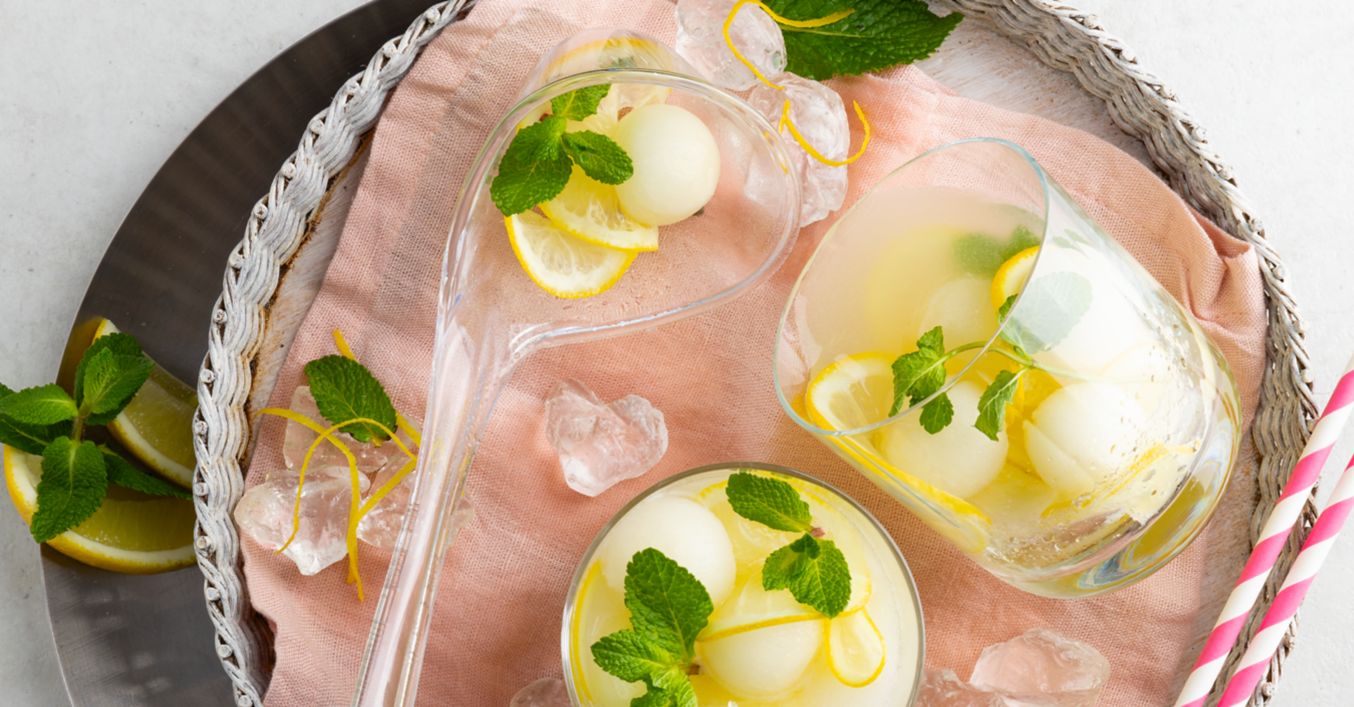 Zitronenbowle mit Melonenkugeln und Melisse
