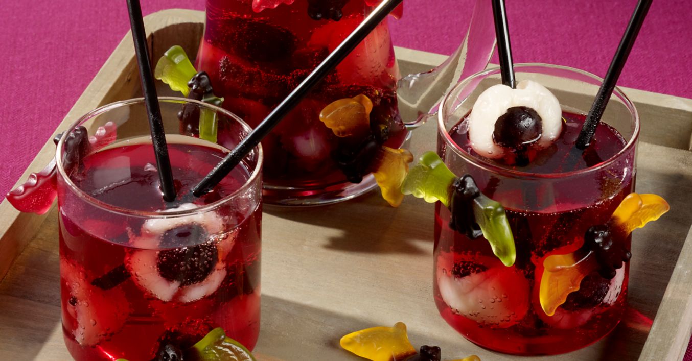 Mit gut gekühlter Zitronenlimonade aufgießen, in Gläser füllen und mit dicken schwarzen Strohhalmen servieren. Nach Wunsch mit Fruchtgummi Fledermäusen garnieren.