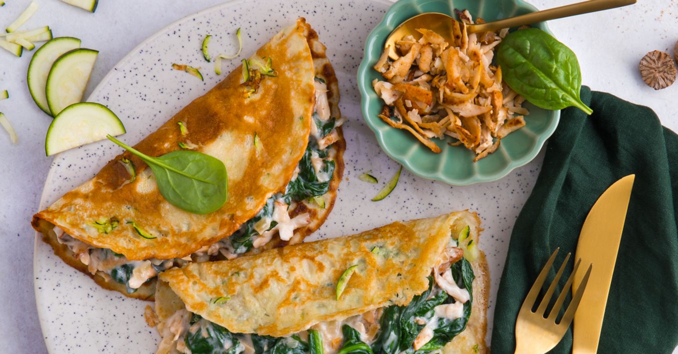 Frischkäse unterrühren und mit Muskatnuss sowie Salz und Pfeffer abschmecken.Die Palatschinken mit der Tofu-Spinatmasse bestreichen, mittig zusammenfalten und heiß servieren.