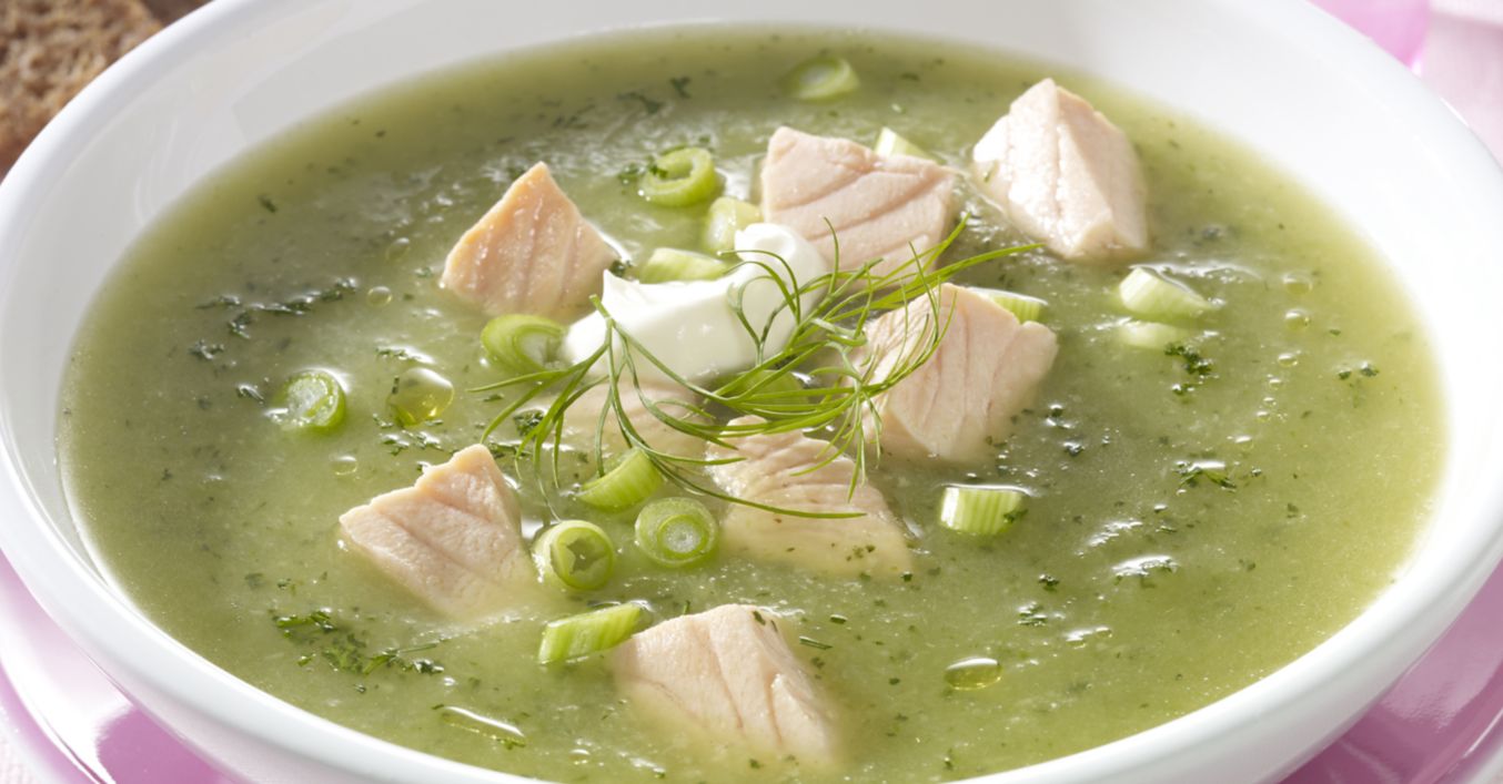 Lachsfilet trocken tupfen und in Würfel schneiden. Lachswürfel circa 5 Minuten in Zitronenwasser dünsten und mit Salz und Pfeffer würzen. Zucchinisuppe pürieren, mit Frischkäse verrühren sowie mit Frühlingszwiebel verfeinern. Lachswürfel zur Suppe geben und mit Joghurt und Dill garnieren. Zucchinisuppe mit Brot servieren.