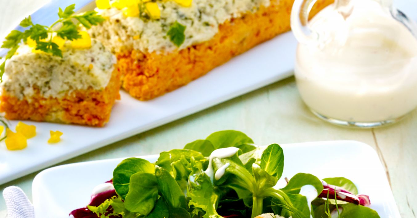Terrine in Scheiben schneiden, mit Salat und nach Wunsch mit Paprikawürfeln und Kräutern garniert servieren.