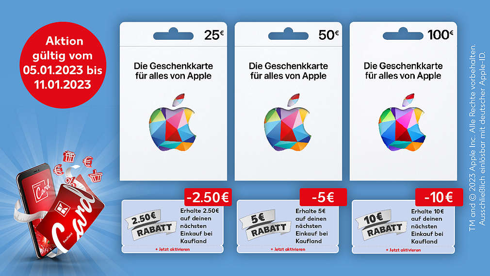 - Kaufst du eine Apple Geschenkkarte in Höhe von 25 Euro, erhältst du einen Coupon in Höhe von 2.50 Euro.